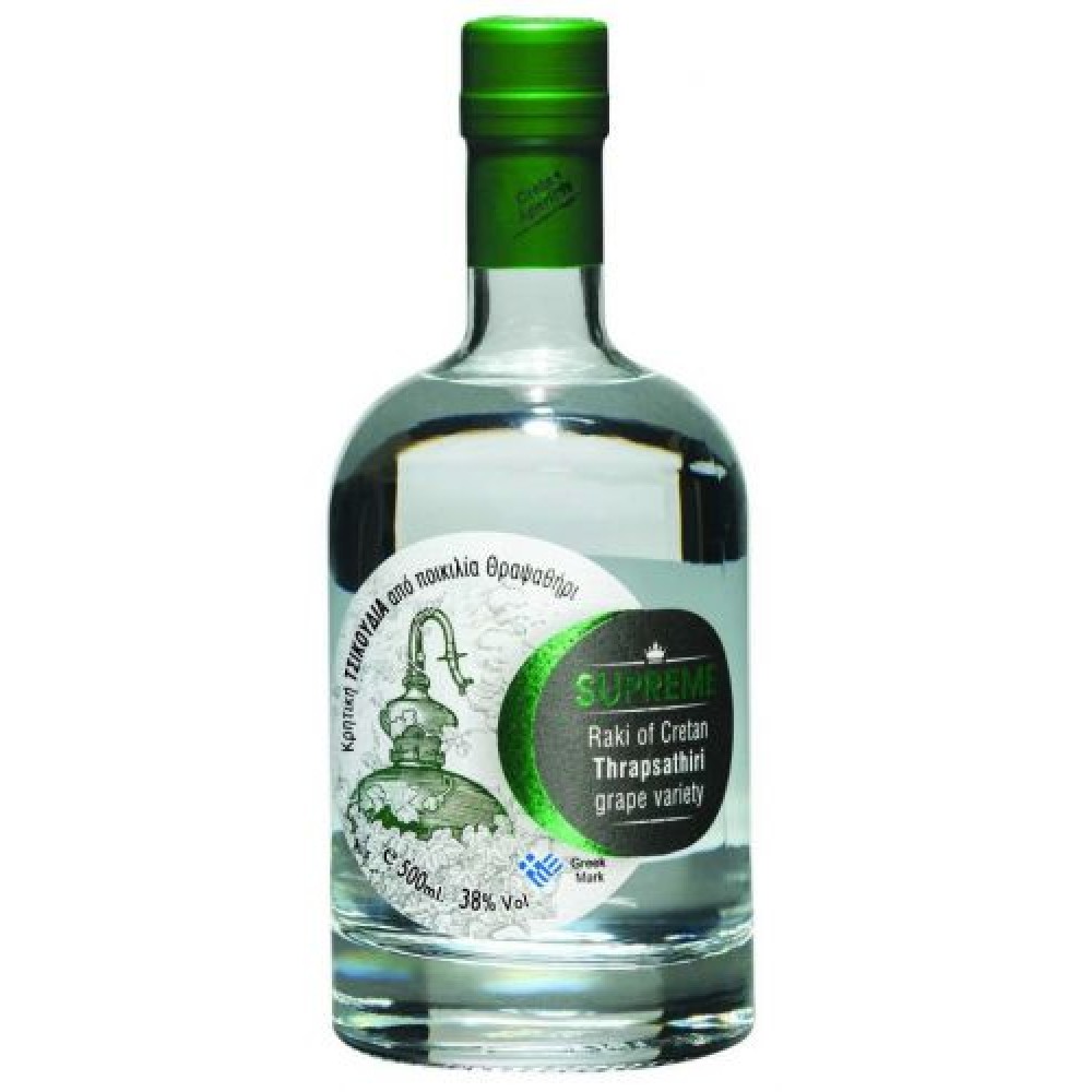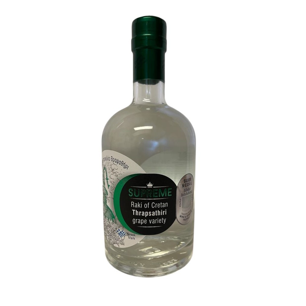 A rare white grape variety from Crete, Thrapsathiri, known for its elegant and delicate aromatic profile. The tsikoudia is produced from carefully selected grape pomace, which is gently processed at low temperatures with the addition of water and then distilled to preserve its refined character.